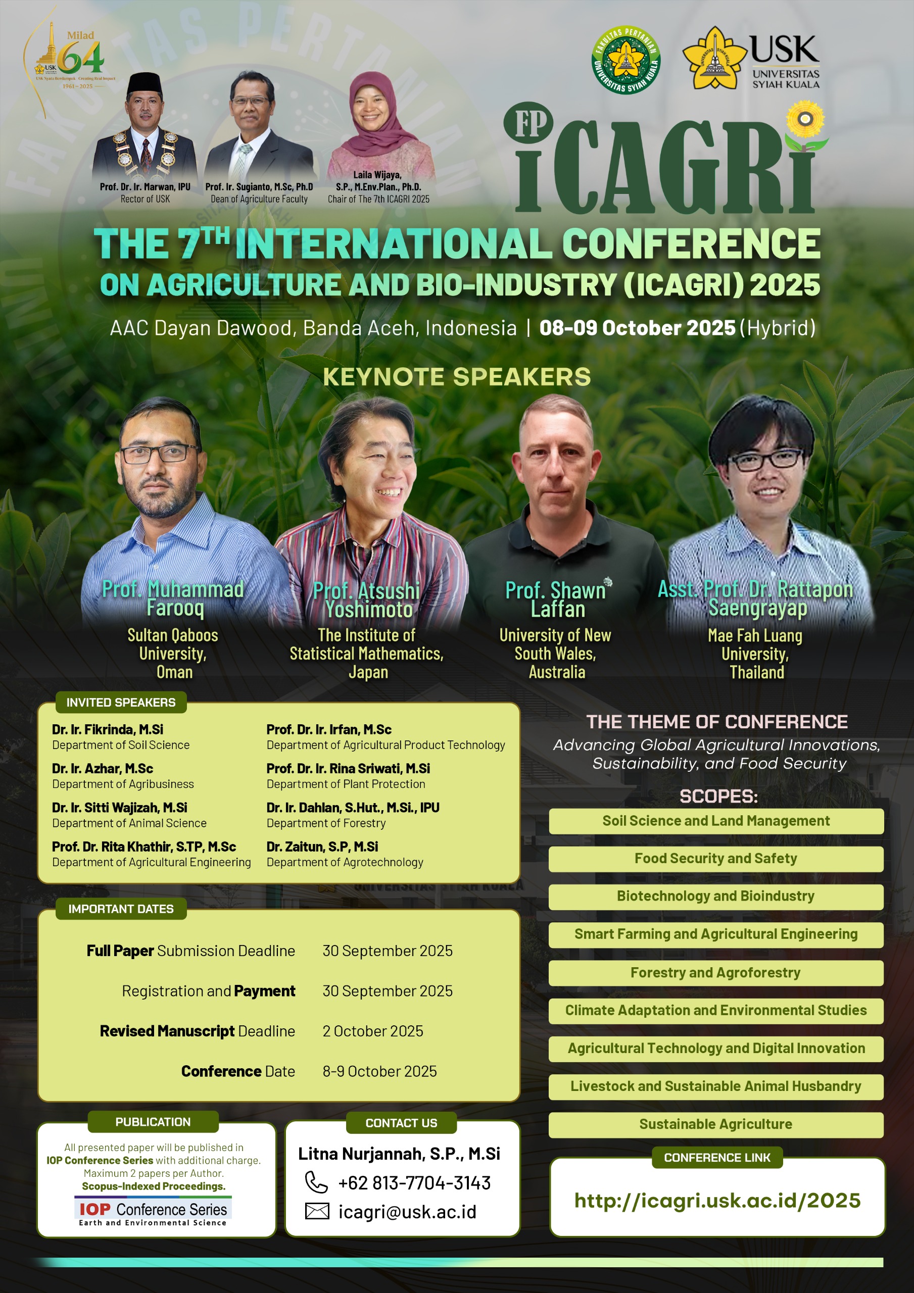 The 7th International Conference on Agriculture and Bio-industry (ICAGRI 2025) invites researchers, academics, policymakers, and industry professionals to share knowledge, present research, and discuss innovations shaping the future of agriculture. The event will be held on October 8-9, 2025, in Banda Aceh, Indonesia, hosted by the Faculty of Agriculture, Universitas Syiah Kuala.